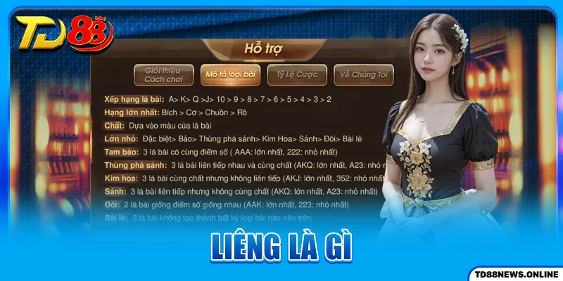 Liêng là gì? Đây là một trò chơi khá phổ biến trong giới game bài hiện nay được đông đảo thành viên tham gia. Với lối chơi thú vị, mọi người còn có thể thể hiện kỹ năng chơi bài của mình và rinh về phần quà hấp dẫn. Trong bài viết hôm nay, hãy cùng TD88 khám phá chi tiết hơn về tựa game này nhé.